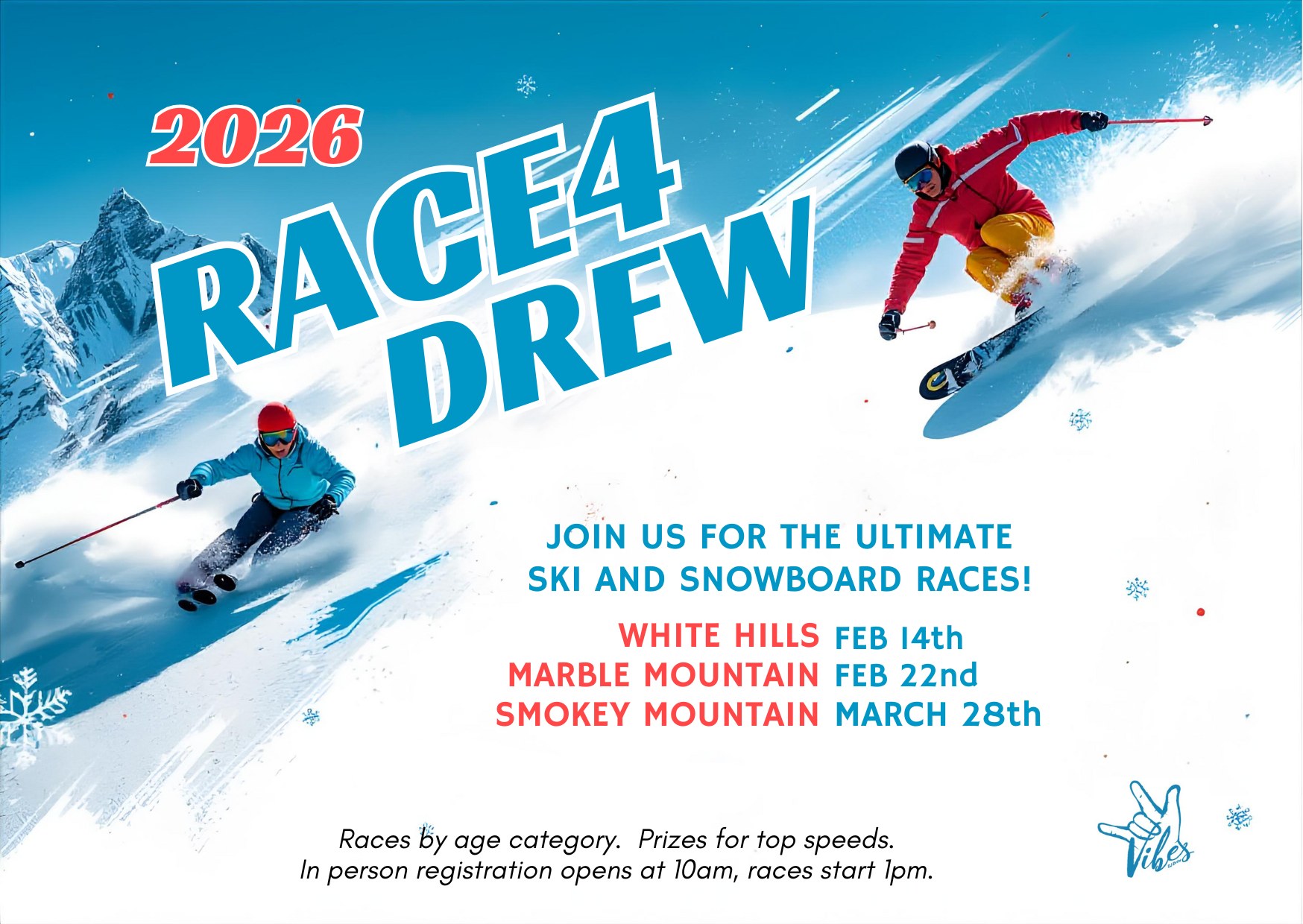 Races by age category. Prizes for top speeds. In person registration opens at 10am, races start at 1pm.